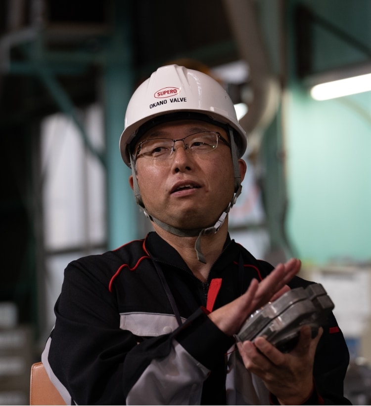 物理と向き合うOKANOの製品は誤魔化しが効かない。高温高圧の流体は誤魔化しの隙間に必ず浸透してくる。だからものづくりの現場では、熟練工は常に真剣勝負で妥協せずに製品を作りこんでいるし、若手や新人にも叩きこむのはまずこの部分です。1人1人がものづくりに妥協しないからこそ、OKANOの品質が保たれていると思っています。例えば、現場には「梅雨時は不良品が多い」という伝承があるんだけど、気象条件の少しの変化が製品に影響を及ぼすんです。ステライトの溶接では、「汗をかく」という言い方をするけど、普通の人じゃ絶対に解らない、金属を加熱して表面が薄っすら濡れたように見える状態、ここを見分けて溶接をしていく。溶接の炎も製品の形状や周囲の温度も踏まえて使い分けていく。製造業の現場見学は、だいたいどこも写真撮影はNGにしていて、うちも昔はNGだったけど、よく考えたら何を隠してるんだろうって思い、今は好きなだけ撮影してもらっています。写真や動画くらいで盗める技術は技術って呼ばないという自負があるから。