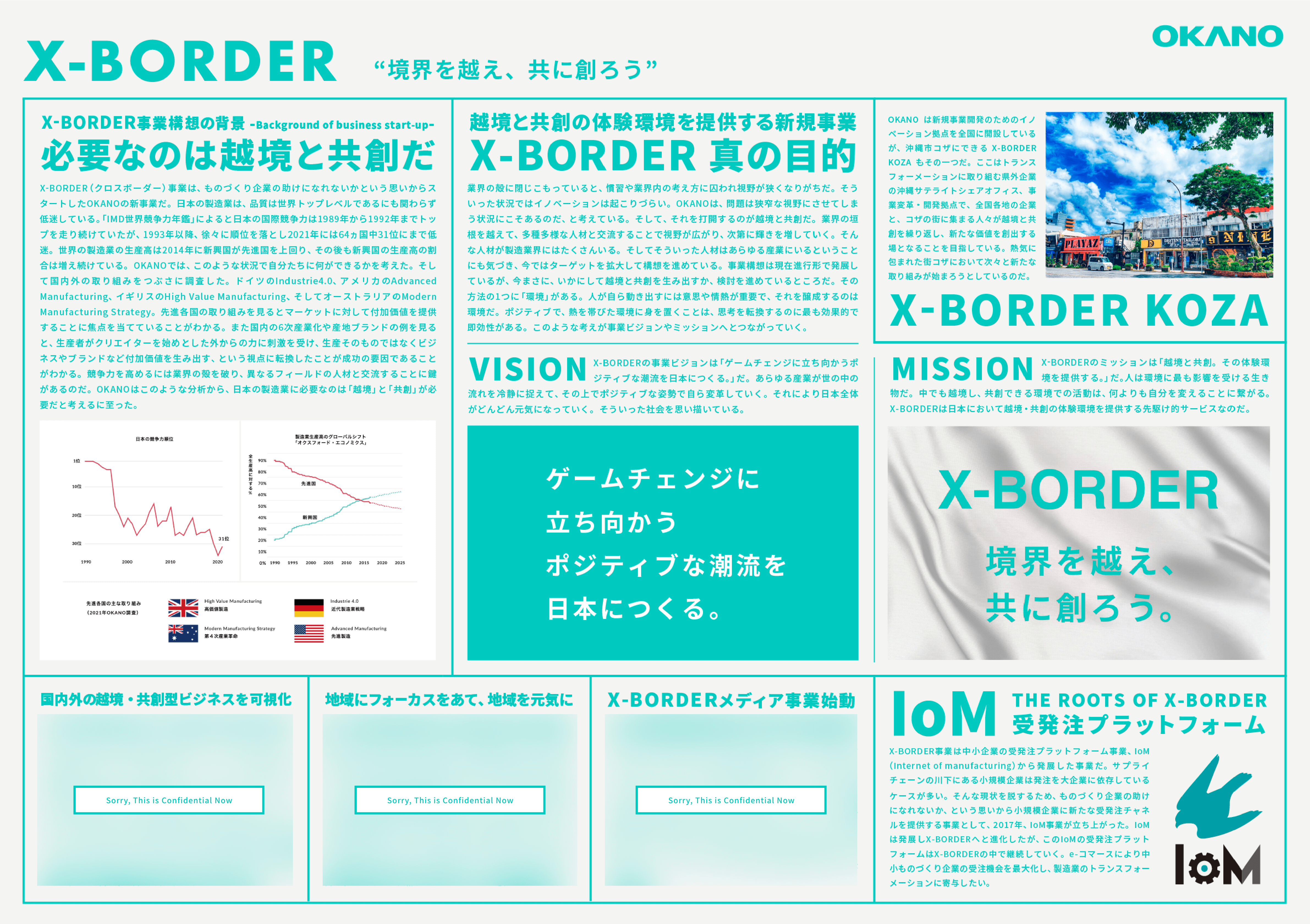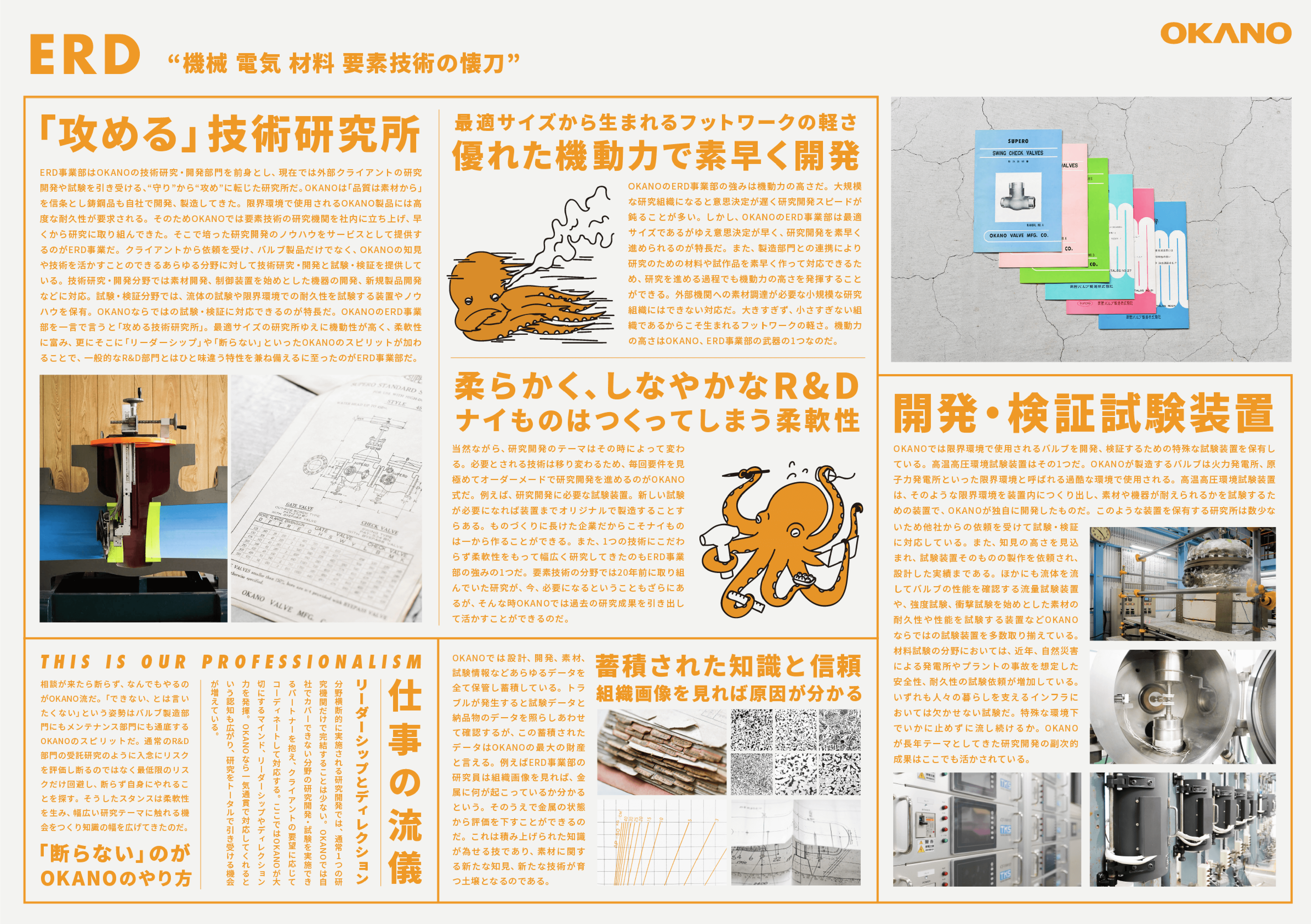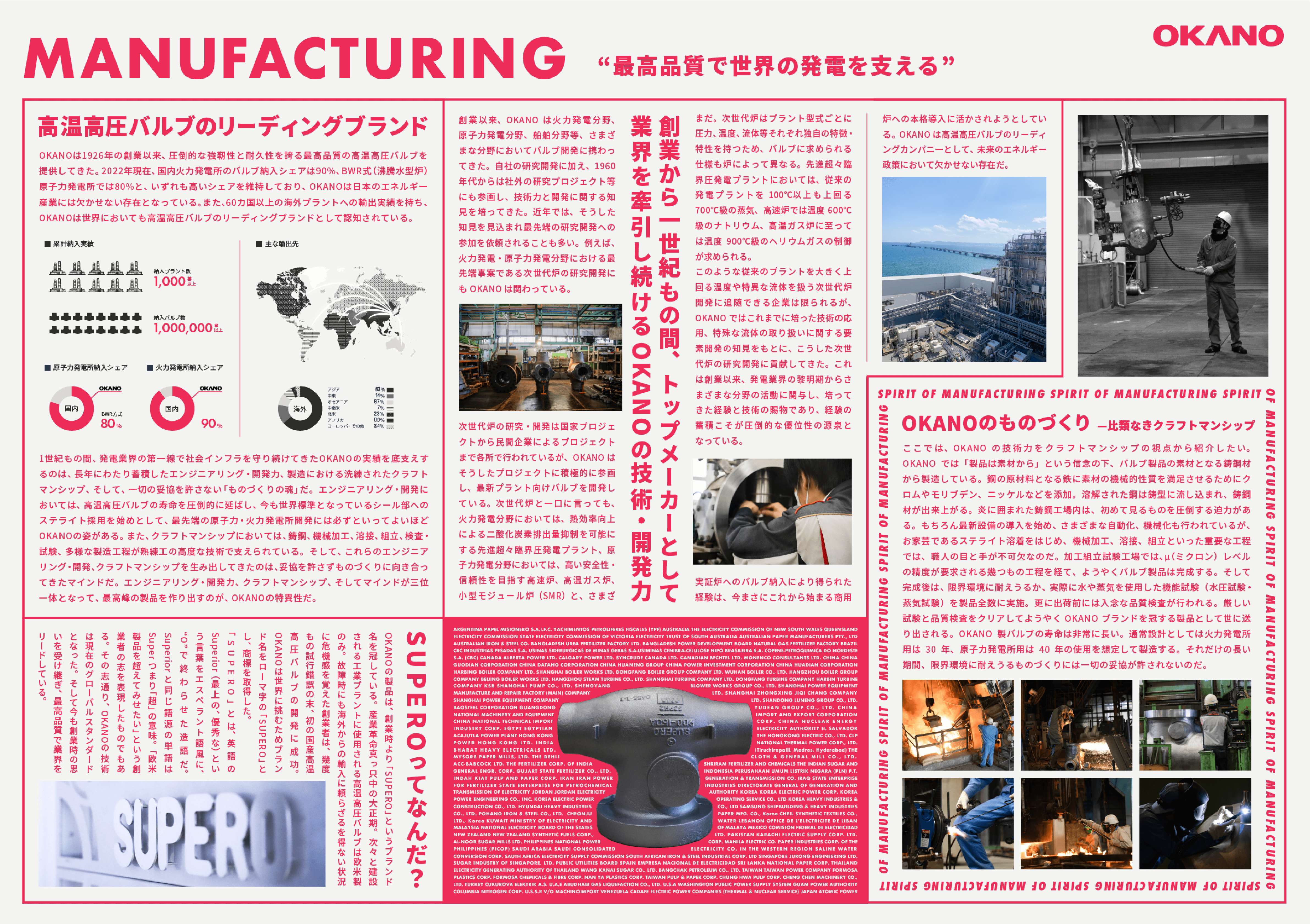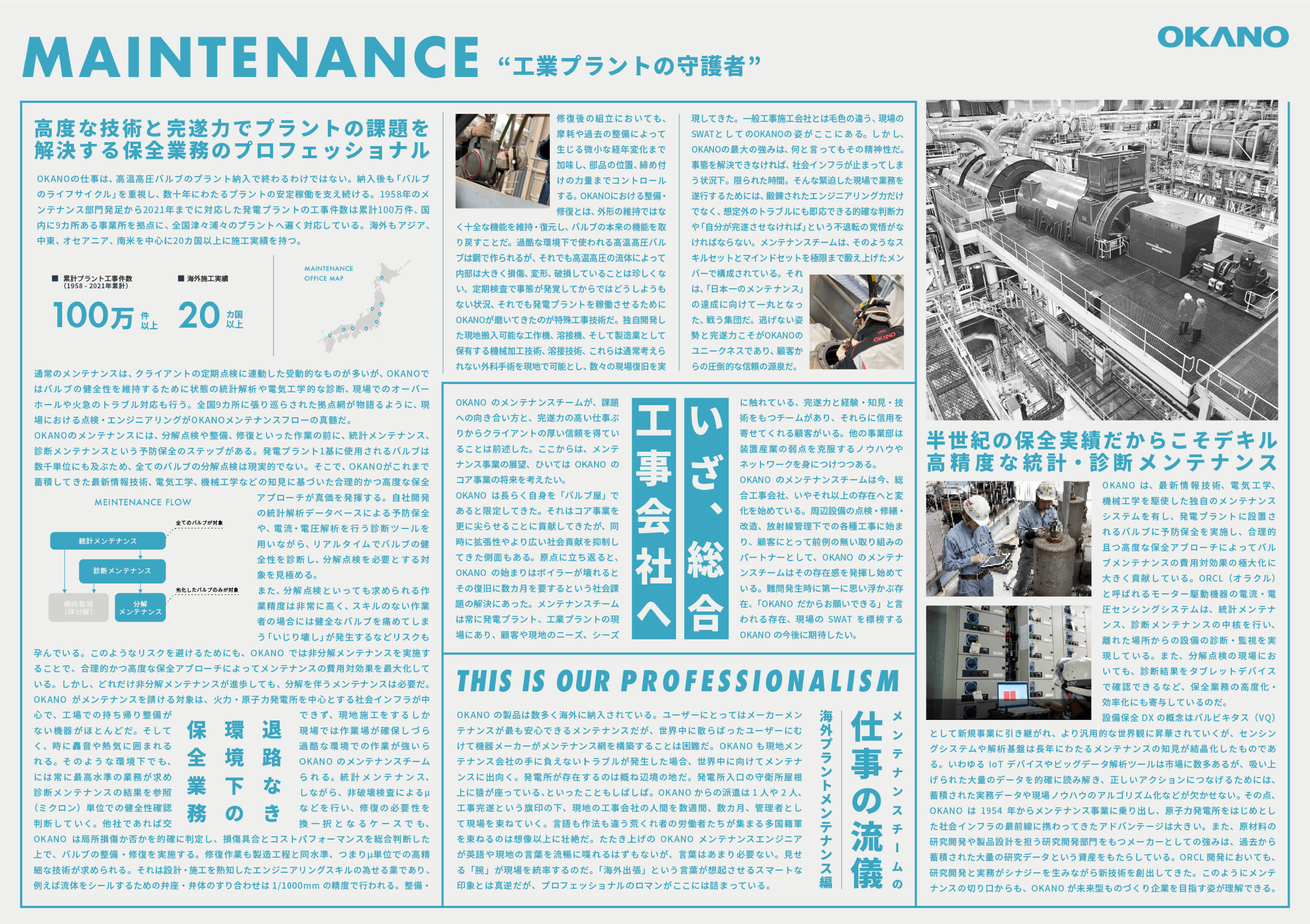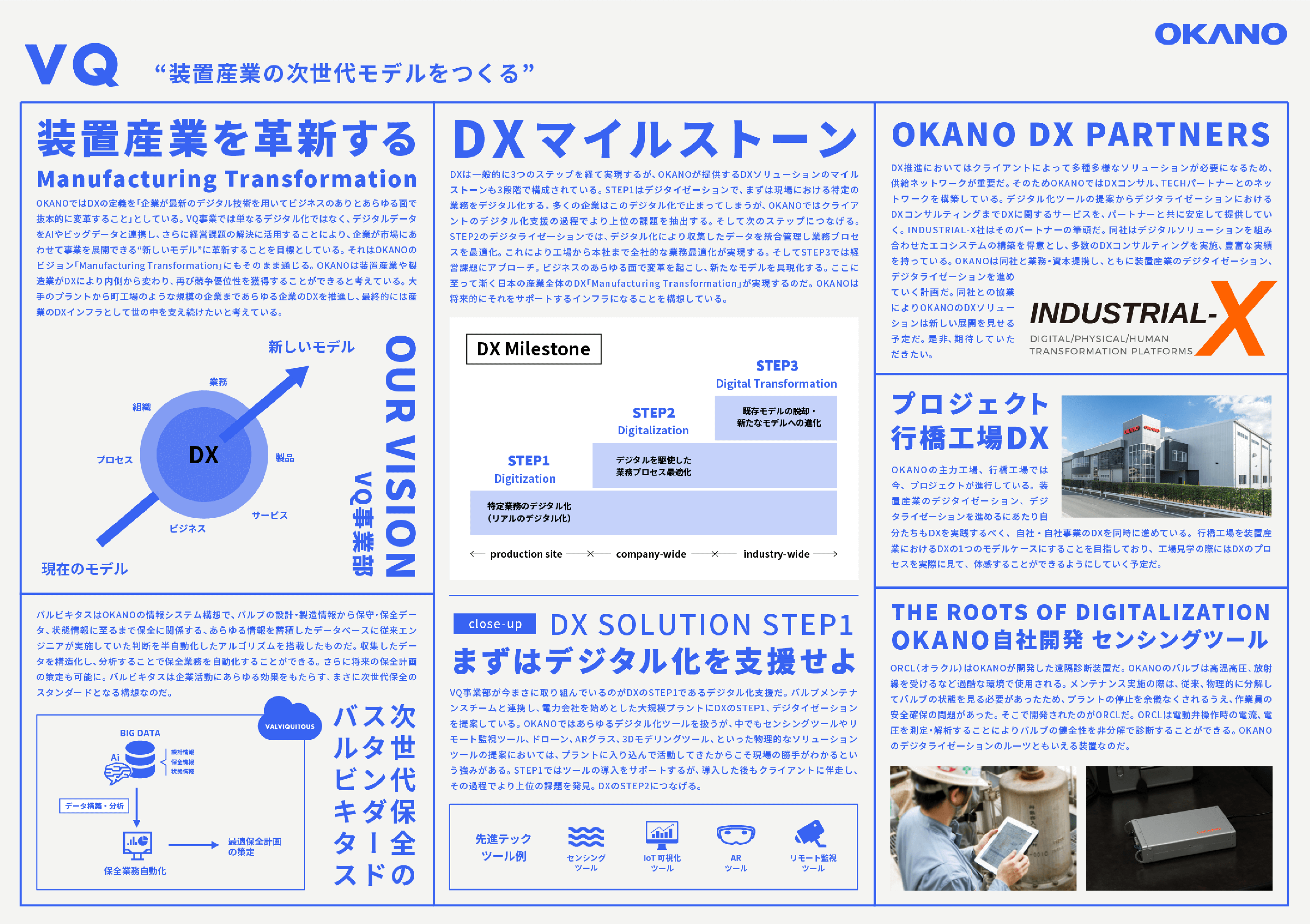 SOLUTION ソリューション一覧 X-BORDER VQ ERD MANUFACTURING MAINTENANCE X-BORDER プラットフォーム事業 “境界を越え、共に創ろう” X-BORDER(クロスボーダー)事業は越境と共創の体験環境を提供するOKANOの新規事業です。業界や業種の枠を越え、多様な人材の交流が生まれる環境や情報を提供することにより、あらゆる産業において既存の思考や慣習にとらわれない新しい価値を生み出すきっかけを作ります。 詳細を見る RELATED CONTENTS 境界を越え、共に創ろう。X-BORDER KOZA・S-TOKYO RELATED SITE X-BORDER事業部が運営するサイト「IoM(Internet of Manufacturing)」は中小企業のための受発注プラットフォームです。 VQ Valviquitous DXソリューション事業 “装置産業の次世代モデルをつくる” VQ(バルビキタス)事業は装置産業のDXを支援するOKANOの新規事業です。発電プラント、石油化学プラント、大規模工場から町工場まで、世界や他産業と比較して遅れをとっている装置産業のデジタライゼーション、更にはDXまでを推進することにより日本の競争力を再度高めます。 詳細を見る RELATED CONTENTS 装置産業 DX構想 バルビキタス OKANO PARTNERS INDUSTRIAL-X ERD ENGINEERING RESEARCH & DEVELOPMENT 技術研究・開発事業 “機械 電気 材料 要素技術の懐刀” ERD事業は外部クライアントの研究開発や試験を引き受ける技術研究・開発事業です。OKANOが培った要素技術を活かし、素材から装置、新製品まであらゆる分野の研究開発に対応、試験分野では流体試験、耐久性試験など当社が保有する特殊な試験装置とノウハウにより試験・検証に対応します 詳細を見る MANUFACTURING バルブ製造事業 “最高品質で世界の発電を支える” バルブ製造事業は原子力・火力発電所向け高温高圧バルブを主力製品として製造するOKANOのコア事業です。同分野におけるリーディングカンパニーである当社の製品はこれまでに1000基以上、国内はもとより世界中の発電所に納入され、電力という社会インフラを支え続けています。 詳細を見る RELATED CONTENTS 社会インフラを守り続ける者たち RELATED SITE OKANOの100%子会社である岡野クラフト株式会社は、岡野グループにおいて「Craft(職人技術)」を集約した会社です。製造、工事を中心に、日本と世界を支える職人集団として日々進化しています。 LIBRARY OKANOのこれまでの製品、サービス、技術情報については、ライブラリーサイトでご覧いただけます。 製品・サービス情報 技術情報 RELATED MOVIE MAINTENANCE メンテナンス事業 “工業プラントの守護者” メンテナンス事業はバルブ製造事業と並ぶOKANOのもう一つのコア事業です。高温高圧バルブの現地メンテナンス完遂は発電プラント運転再開の必須条件です。当社はこのミッションにおける最後の砦の任を世界中で果たしてきました。現在では発電プラント、バルブ以外にも工事領域を拡げています。 詳細を見る RELATED CONTENTS 装置産業 DX構想 バルビキタス 社会インフラを守り続ける者たち RELATED SITE OKANOの100%子会社である岡野クラフト株式会社は、プラント向けバルブおよび機械類のメンテナンス、各種工事の施工に対応しています。 LIBRARY OKANOのこれまでの製品、サービス、技術情報については、ライブラリーサイトでご覧いただけます。 製品・サービス情報 技術情報